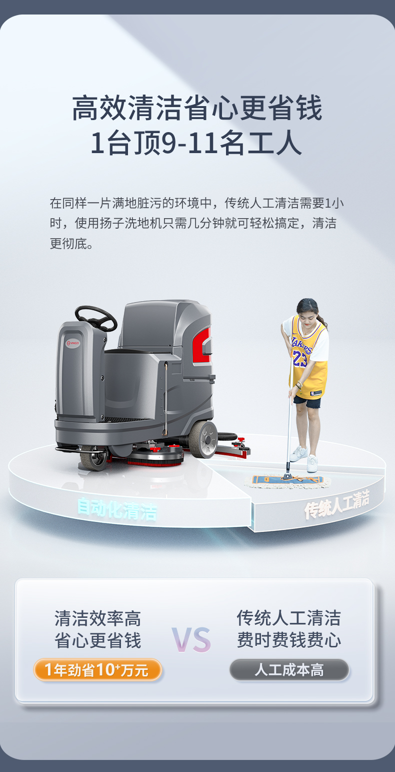 揚子洗地機YZ-X6,硬地毛刷強力清除頑固污垢,橡膠防滑輪加厚防滑不易損壞,智能控制面板一鍵操作輕松上手,防滑站臺保護工作人員安全。
